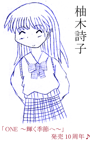 「ONE 〜輝く季節へ〜」より、柚木詩子です。 ONEも今年5月で発売10周年だそうで。 いや〜、色々と感慨深いです。 私のヲタ歴の原点のうちのひとつですからねぇ。 先日久々にやってみたけど、 シナリオの妙とBGMは10年経った今でも色褪せませんね。 で、詩子さん。 ゲームのサブキャラとしては 今でも個人的ランキングの上位に位置しています。 天真爛漫で神出鬼没なところがポイント高いです。 …しかし久弥先生は今頃どうしてるのかなぁ?