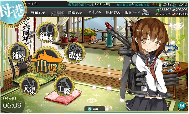 ここで支援艦隊のキラが剥げたので、本日は出撃終了。