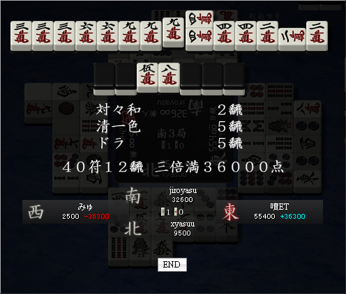 一方で沈んでいったはっくん氏は、すうのツモ上がりでお亡くなりになった。