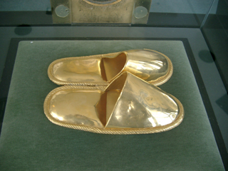 タワー内に展示されてる純金製スリッパ。 重さは左右合わせて2.4kg。 身体を鍛えたい人は鉄ゲタのかわりにどうぞ。