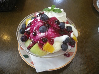 フルーツは、メロン、スイカ、キウイ、バナナ、夏みかん、黄桃、ブルーベリーを使用。