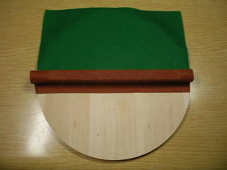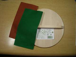 作り方は簡単。 @落しぶたの持ち手の部分を覆うように、 フェルトを木工用ボンドで接着する。(3面) A落しぶたの半円の部分にもう一枚のフェルトを敷く。 (接着は不要) はい、これだけで出来上がり。